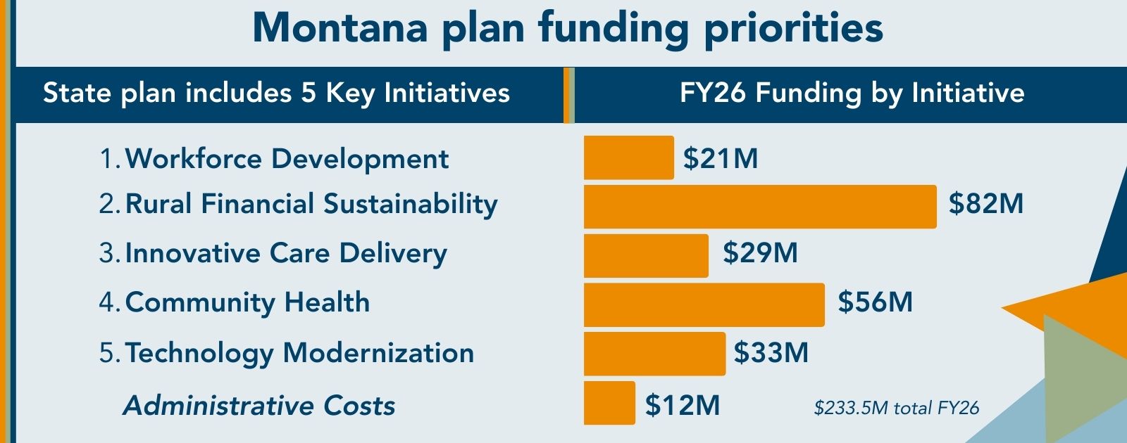 RHTP provides one-time funding that will end in 2030. Montana’s application from DPHSS outlined five core initiatives designed meet CMS compliance requirements and to address the unique challenges of rural health caredelivery in a sustainable manner, including: