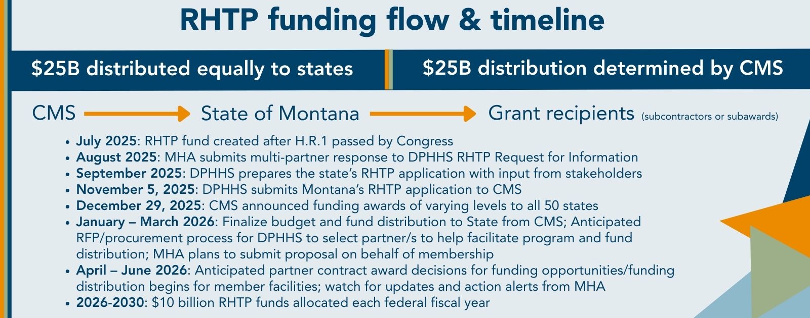 - January-March 2026: Anticipated RFP/procurement process for DPHHS to select partner(s) to help facilitate program and fund distribution; MHA plans to submit proposal on behalf of membership